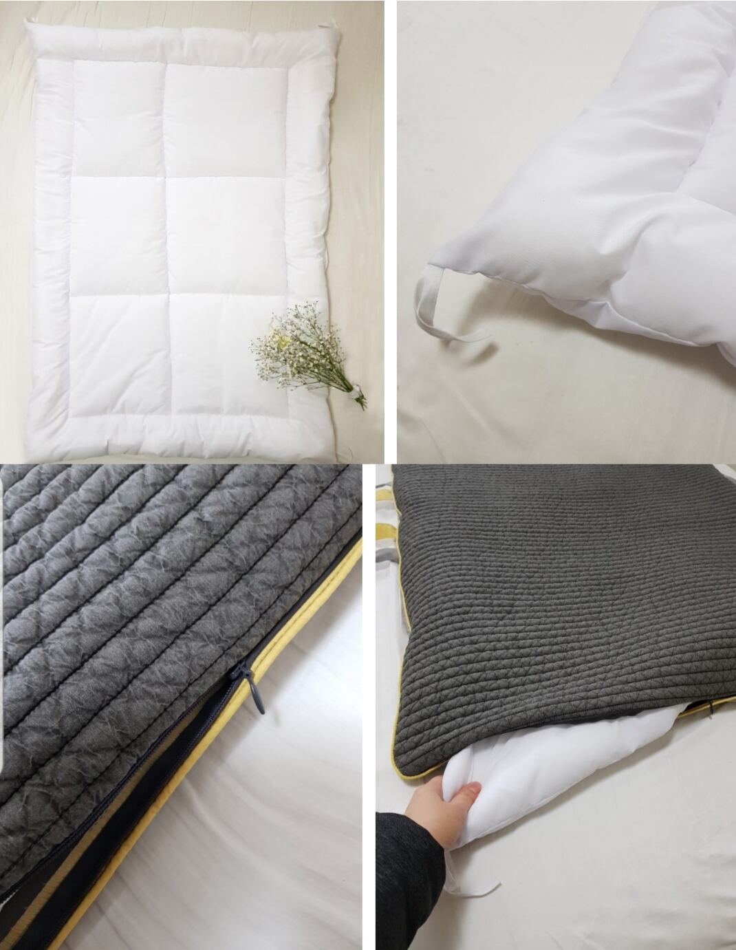 敷布団はカバー式のパッドで、ファスナーで中の綿を取り外せるタイプです。中綿は低デニール綿22オンス。グースの暖かさとラテックスの復元力を同時に備えたマイクロファイバー素材です。四隅にひもがついていて、ずれないように結ぶことができます。