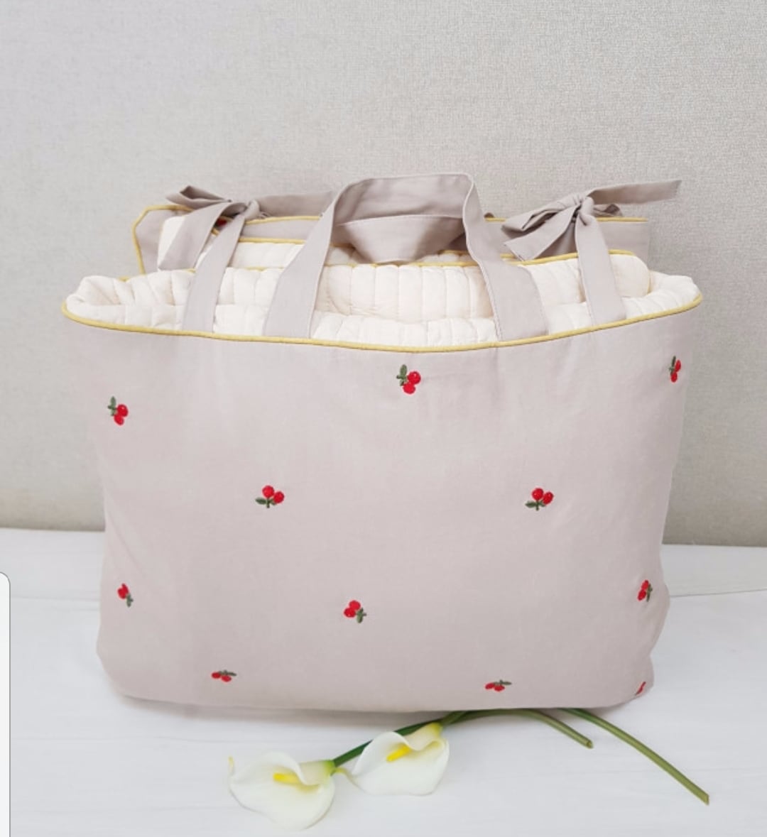 しっかりとした厚みのある敷き布団です。両面使用可能。カバーは綿100%です。片面はチェリー柄のコットン、片面はキルティング。ビグメントウォッシュ加工で、肌触りもさらりと滑らかです。ピンクベージュ生地のレッドチェリー柄になります。