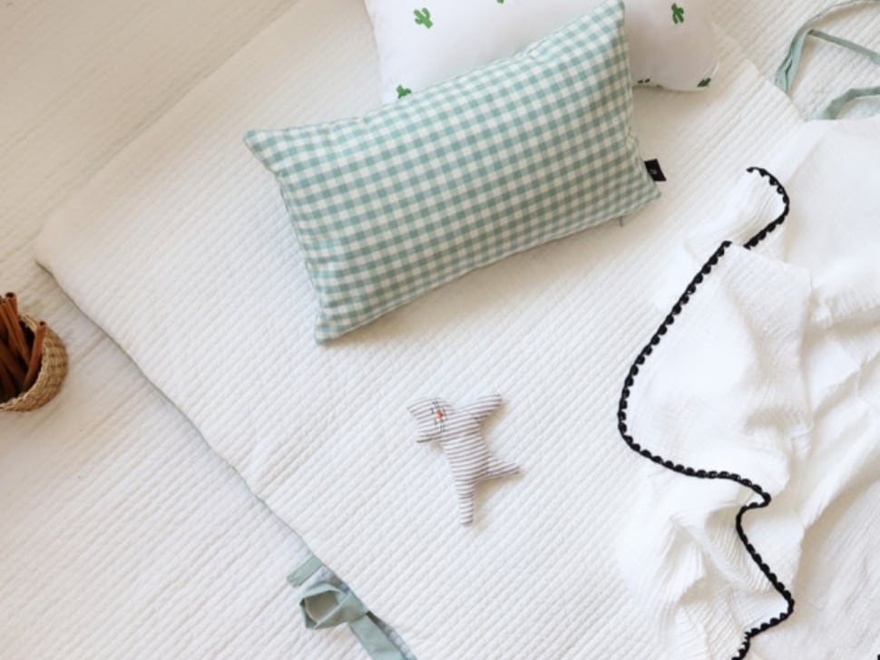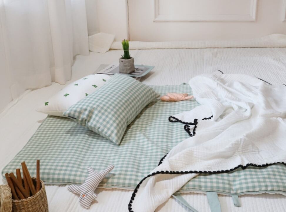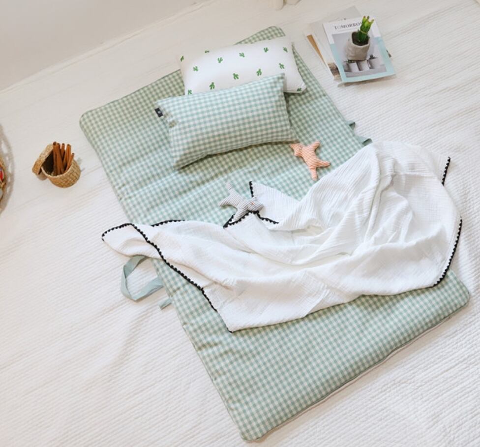 敷布団、掛け布団(ガーゼケット)、枕をコンパクトに持ち運びできる、お昼寝布団セットです。