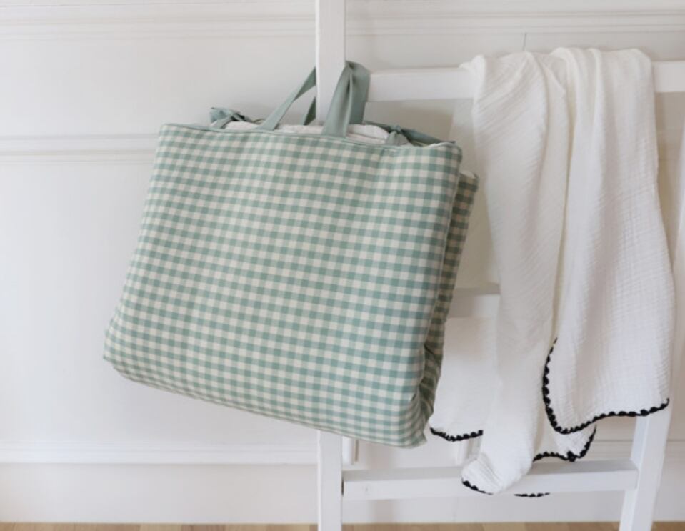 天然ピグメントウォッシュのキルティング綿100%。14オンスの綿を詰め込んでいます。チェックの布は先染め綿100%です。サイドのひもをしばってカバン型に。持ち運びも楽々です。
