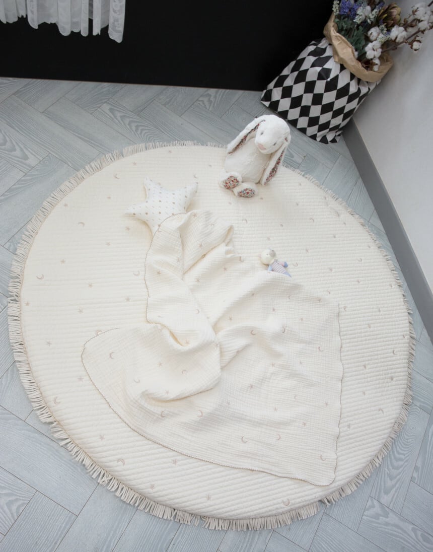 丸型で可愛い、赤ちゃんにも安心のラグマットです!インテリアのポイントにも。