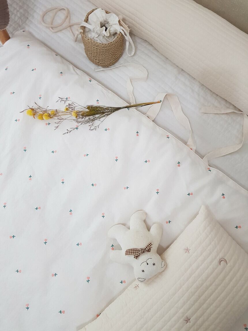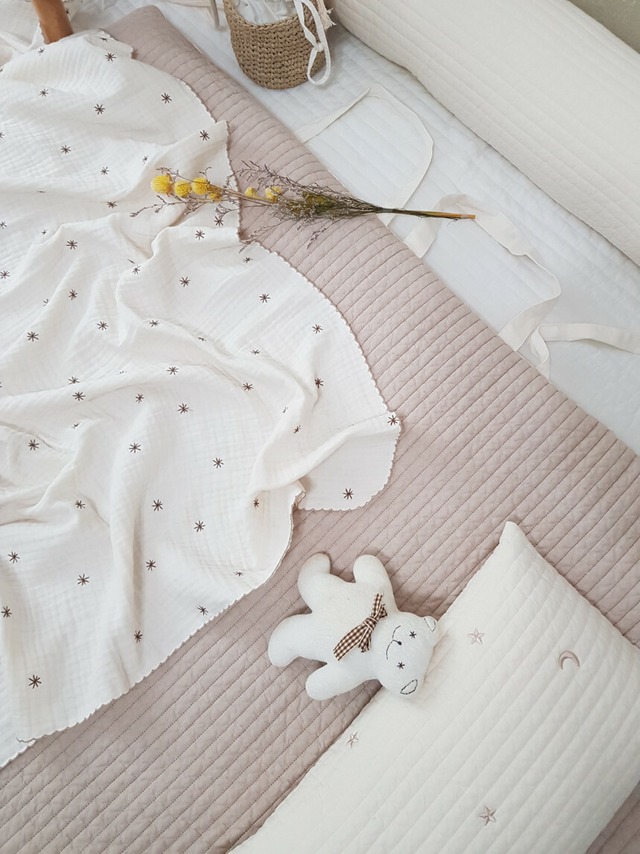 しっかりとした厚みのある敷き布団です。両面使用可能。星のプリント面は3重のガーゼで柔らかく赤ちゃんにも安心です。片面はキルティング加工で、肌触りもさらりと滑らかです。