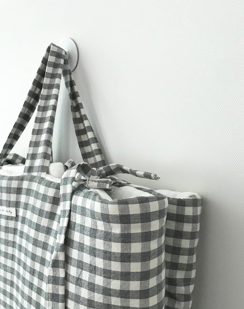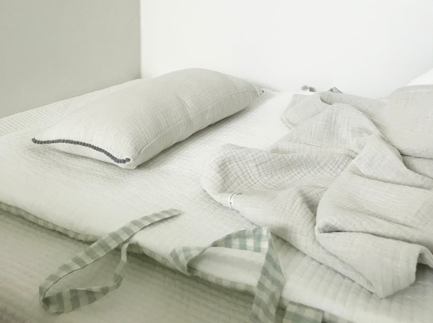 片面は、先染めウォッシング綿100%。優しい風合いのギンガムチェック柄です。片面は60番手のキルティングイブルになります。お色はアイボリーになります。汚れがつきにくく、手触りもさらりと肌触りのよい素材です。