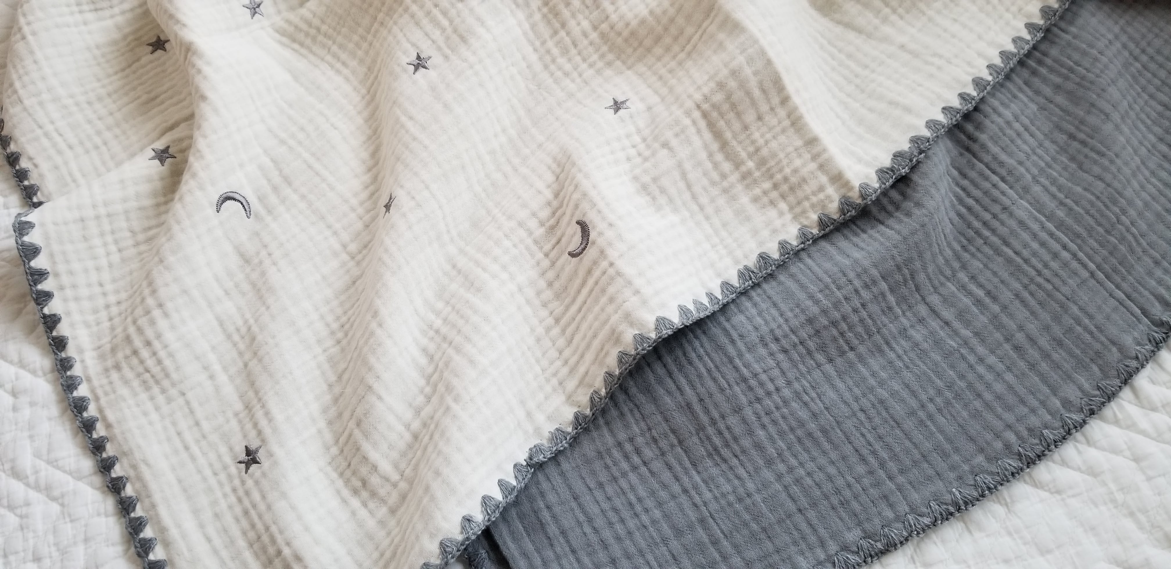 優しいナチュラルなカラーで、そのままお部屋に置いておいてもインテリアに馴染む可愛いデザイン。端のシェルステッチもとても優しい雰囲気です。通常の3重のブランケットの裏に3重の無地のガーゼ生地を合わせて、しっかり厚みのある6重のブランケットです。これからの季節にも、1年中お使いいただけるアイテムです。