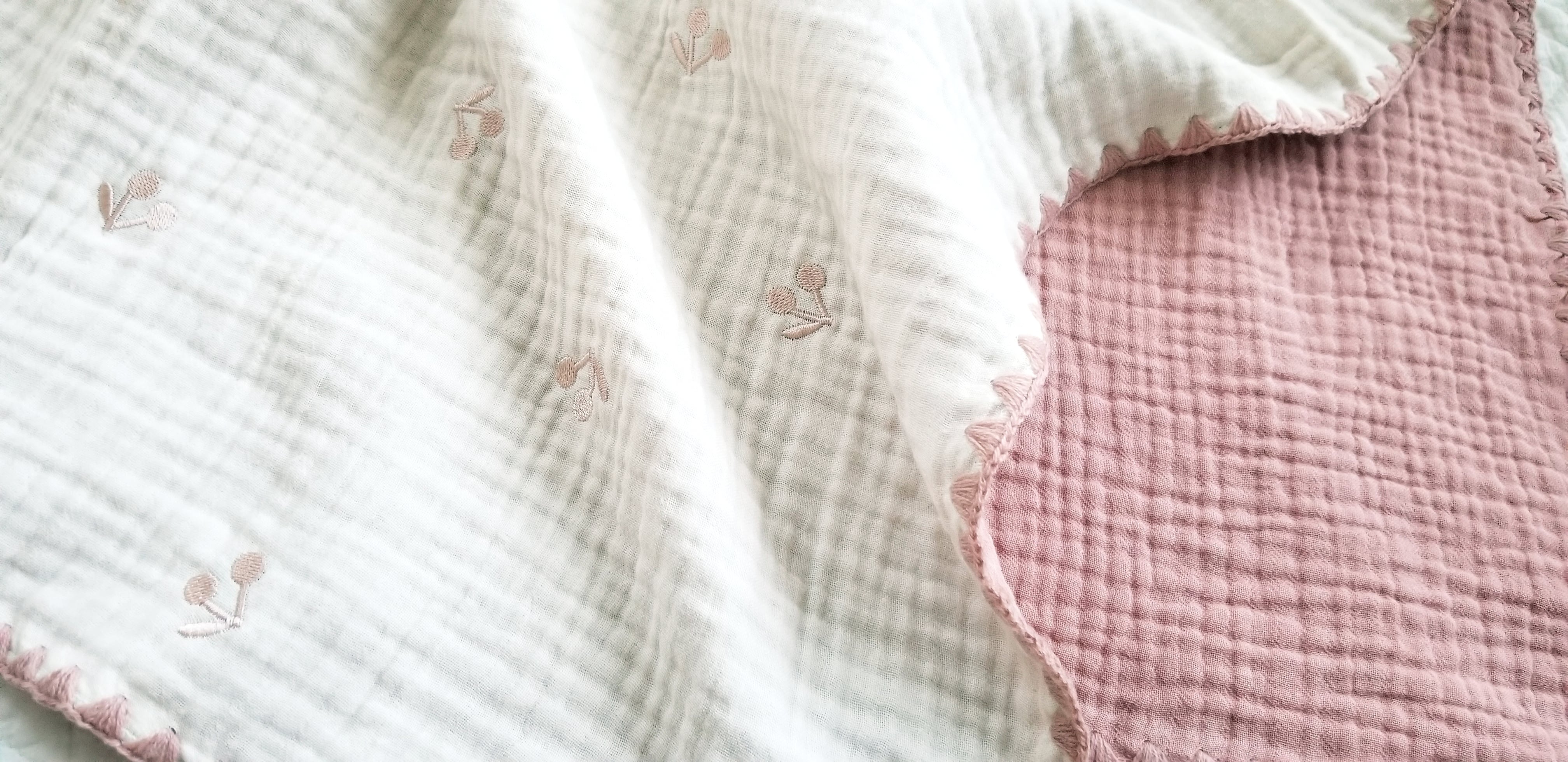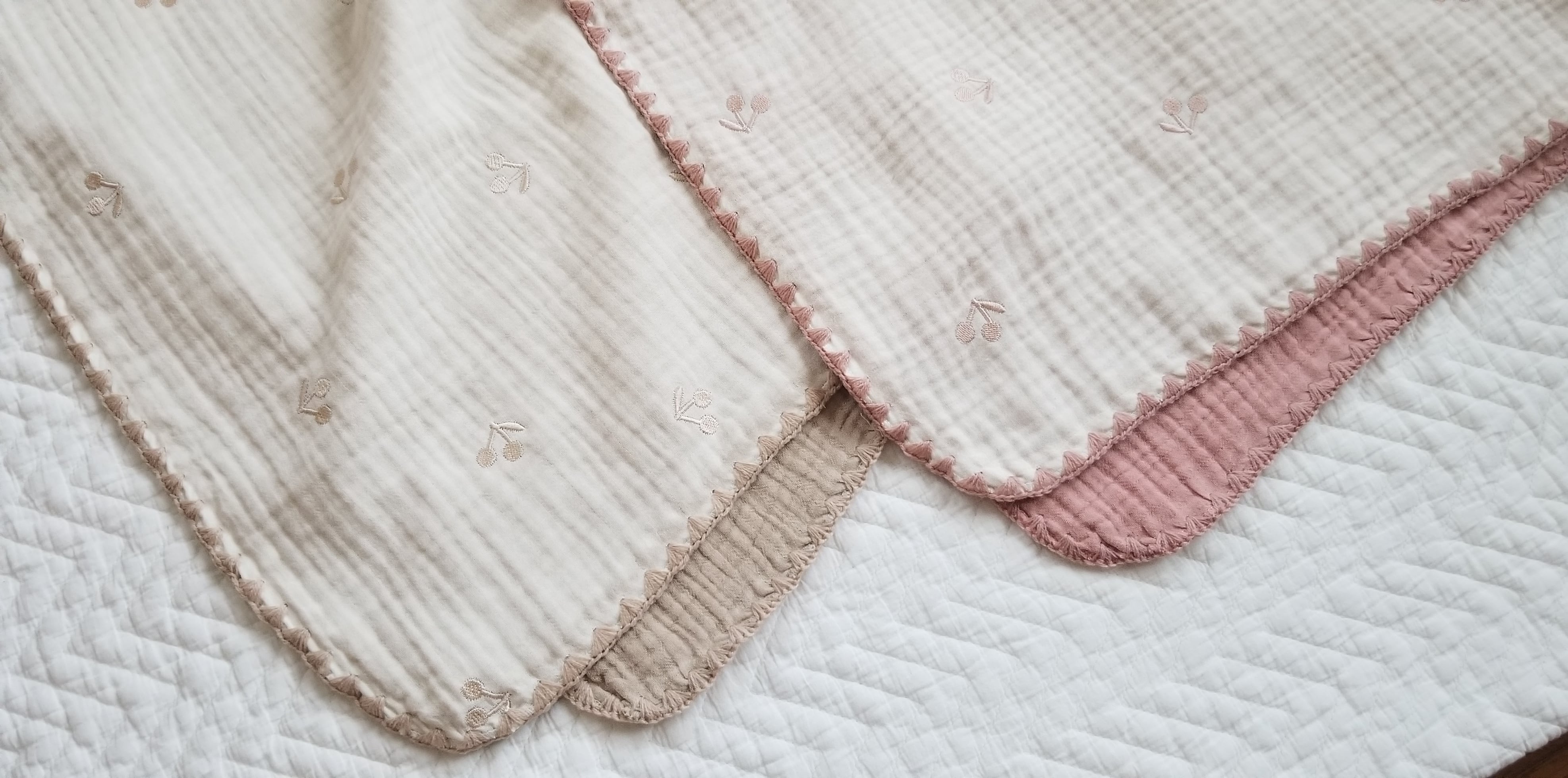 優しいナチュラルなカラーで、そのままお部屋に置いておいてもインテリアに馴染む可愛いデザイン。通常の3重ガーゼに無地の3重ガーゼを合わせて、しっかりとした厚みのある6重ガーゼになっています。これからの季節にも、一年を通して使えるガーゼケットです。