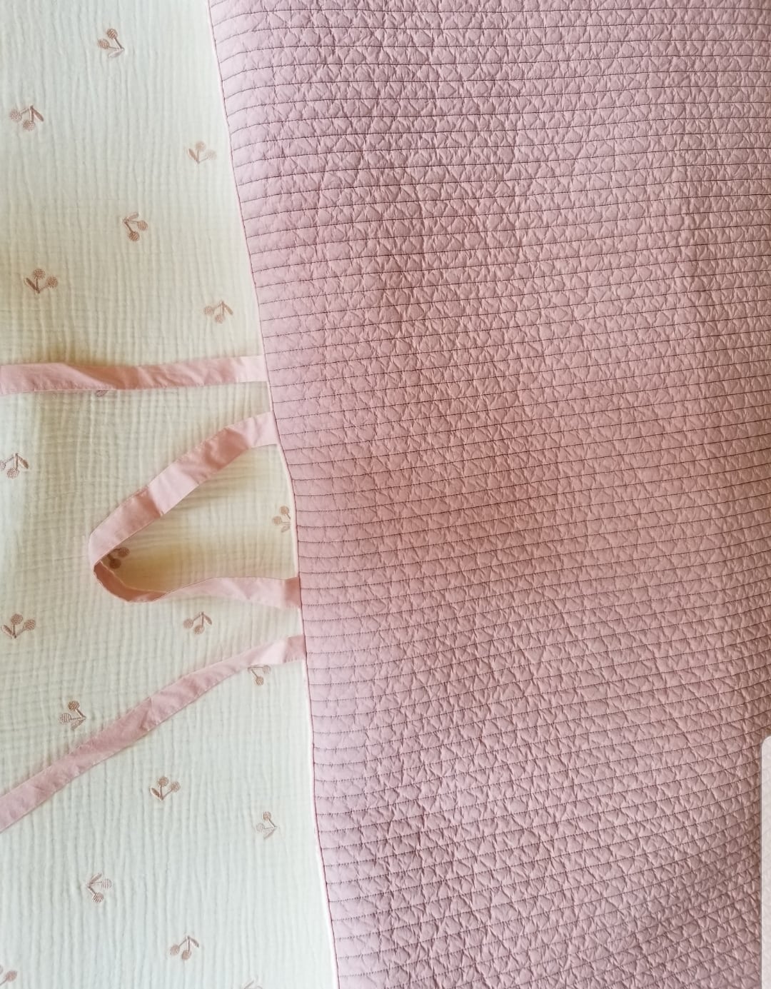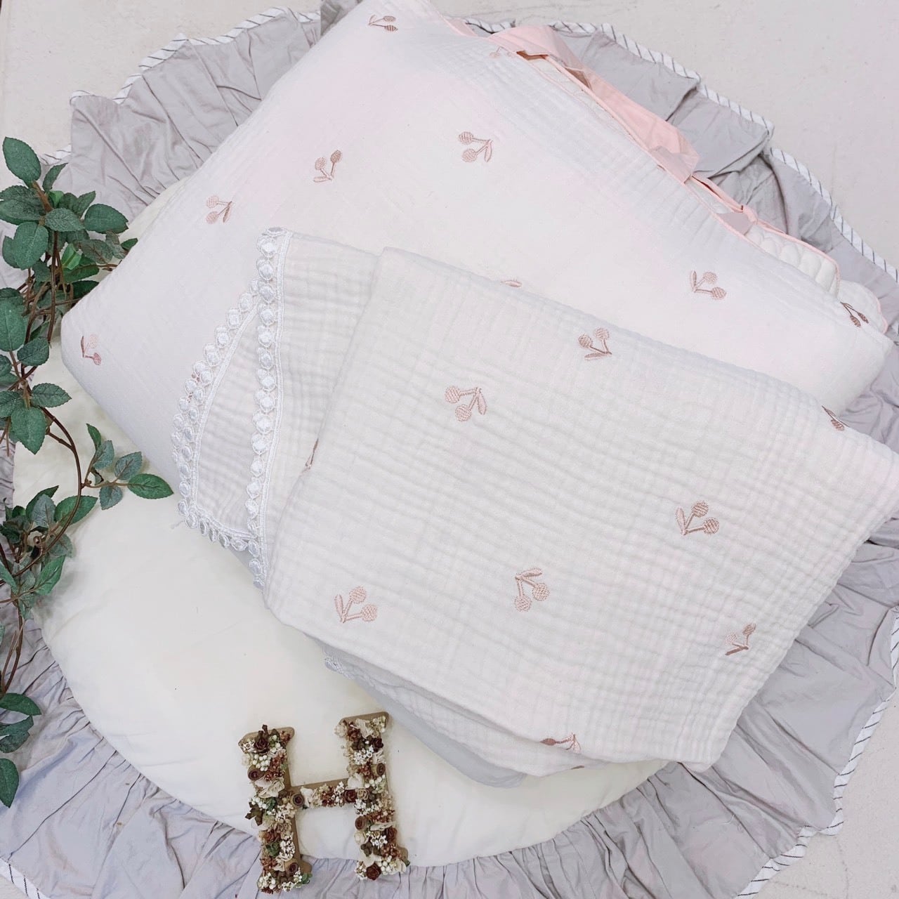 カバー式のお布団より中綿が少なくコンパクトにまとまります。持ち運びやすく、ほどよい厚みの敷き布団です。両面使用可能。チェリーのプリント面は3重のガーゼで柔らかく赤ちゃんにも安心です。片面はキルティング加工で、肌触りもさらりと滑らかです。お色はアイボリーとピンクの2色になります。