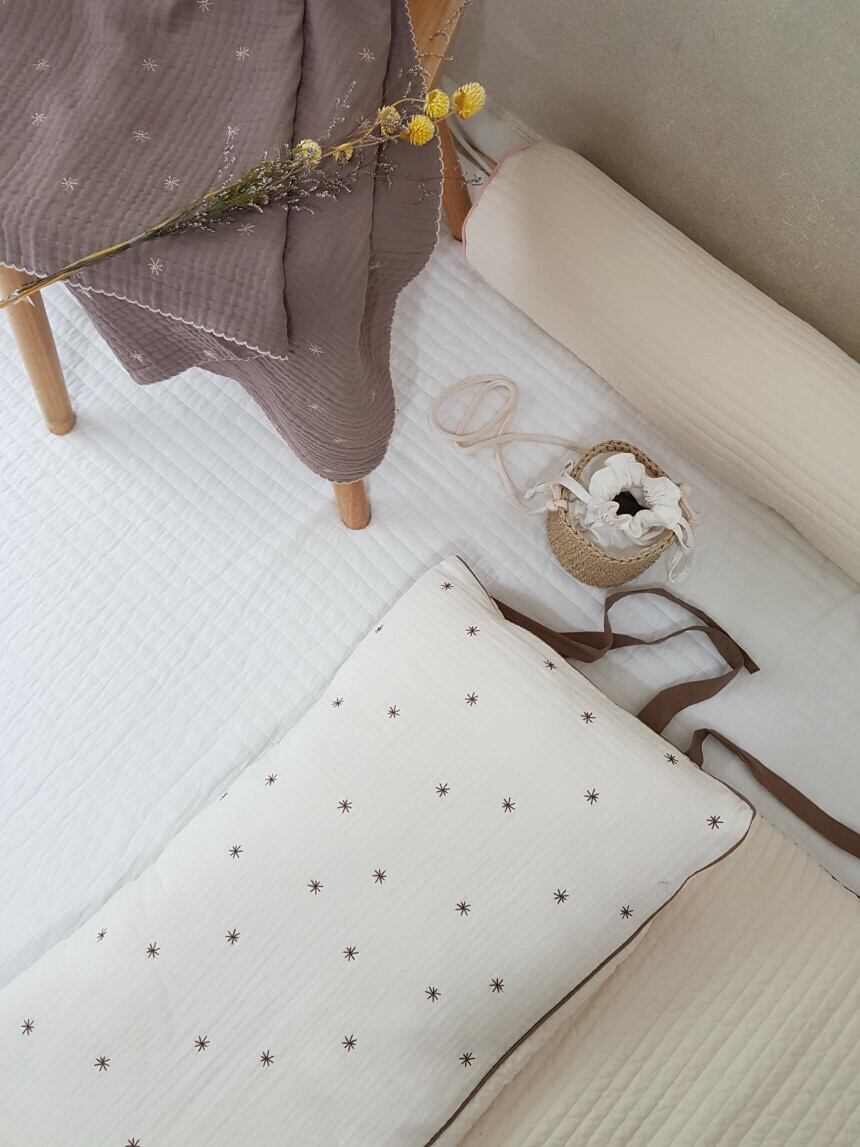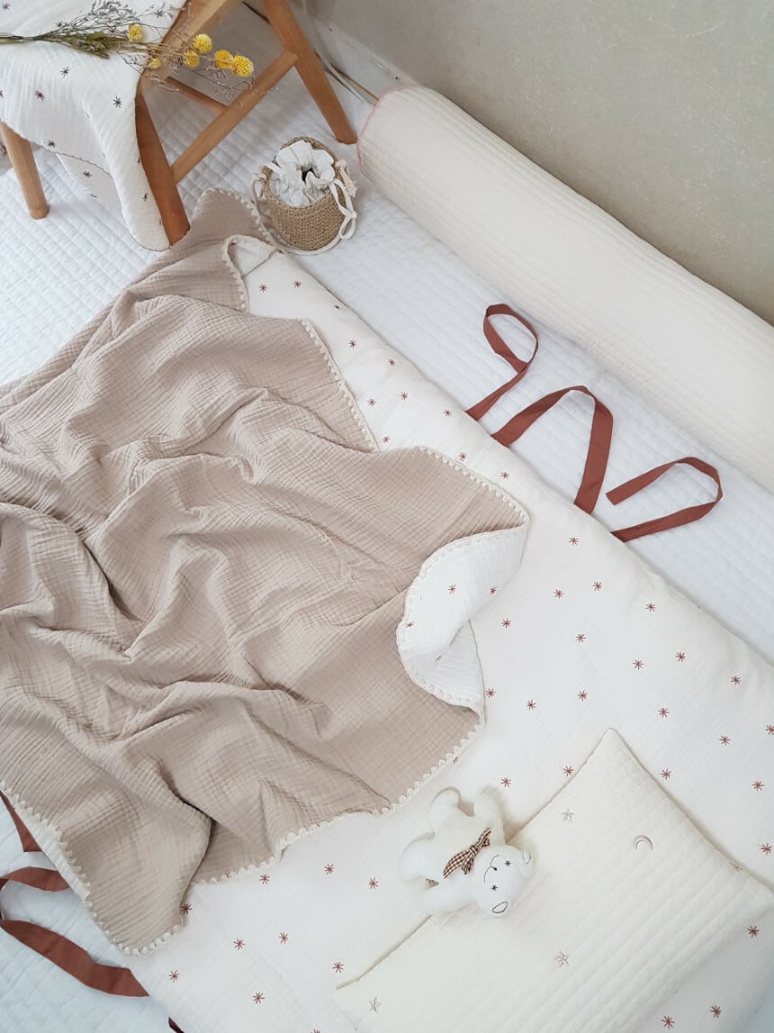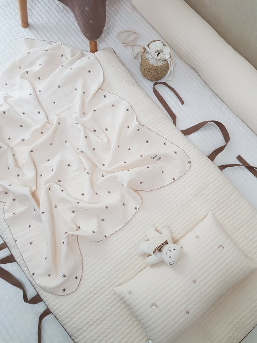 カバー式のお布団より中綿が少なくコンパクトにまとまります。持ち運びやすく、ほどよい厚みの敷き布団です。両面使用可能。星の刺繍面は3重のガーゼで赤ちゃんにも優しい素材です。片面はキルティング加工で、肌触りもさらりと滑らかです。