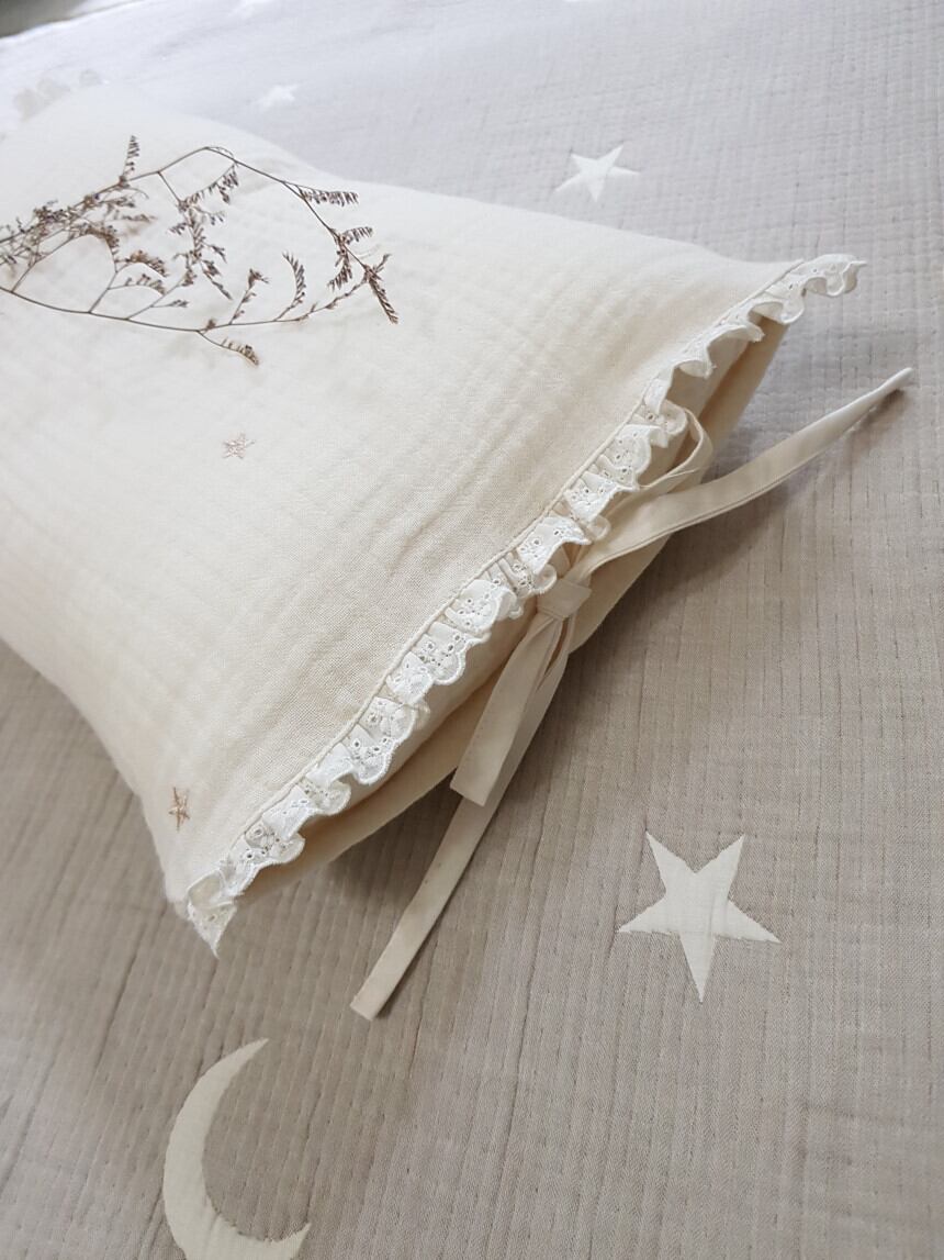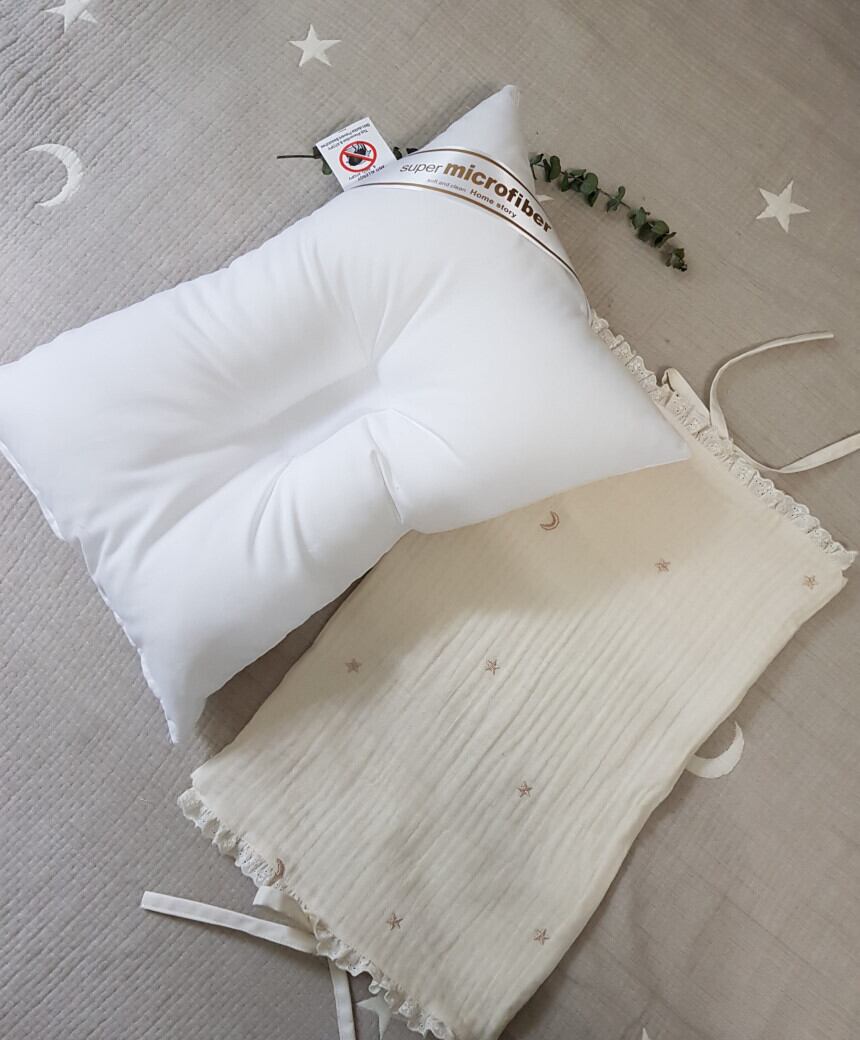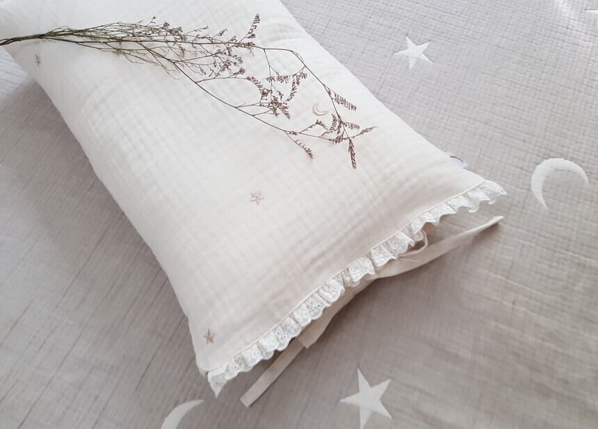 月と星柄の3重ガーゼ生地を使った枕と枕カバーのセットです。