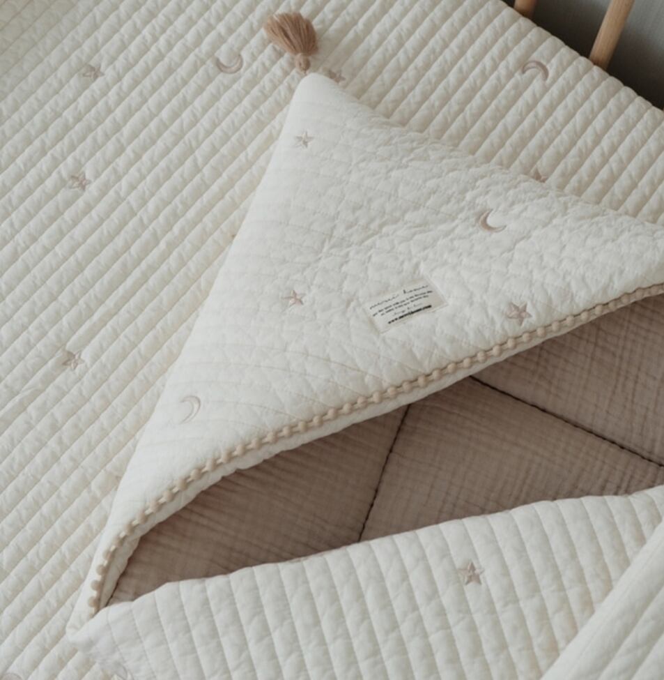 アイボリーのキルティングのイブル生地に月と星の刺繍が施されています。100番手の高密度生地はプレミアムな高級イブル。手触りがとても滑らかで、柔らかく、新生児にも安心してお使いいただけます。裏面は、エアウォッシュ加工の3重ガーゼになっています。シックなベージュでインテリアにも馴染みます。