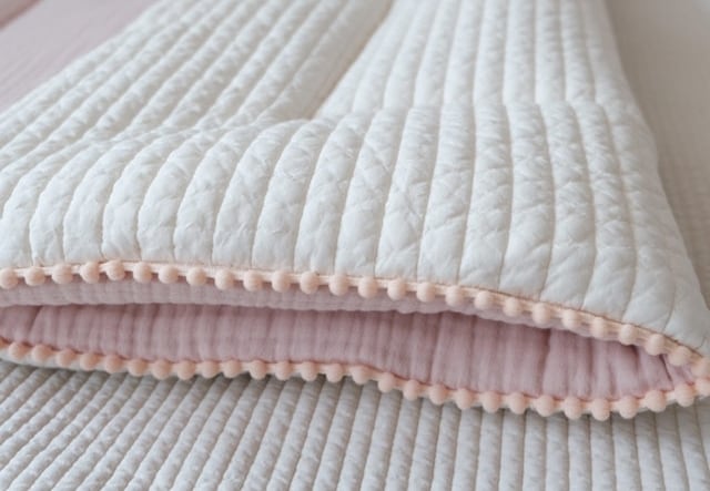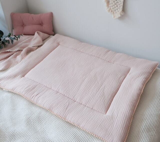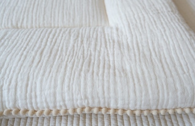 100番手のプレミアムイブル生地と3重のガーゼ生地を使ったお昼寝パッドです。中綿入りでふんわり、一年中安心してお使いいただけます。シンプルな無地に端のポンポンの装飾が可愛らしいお品です。インテリアの邪魔をせず、ご家庭で長くご使用いただけますね。