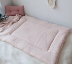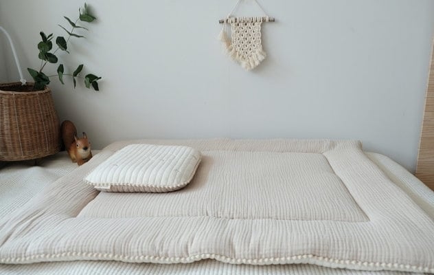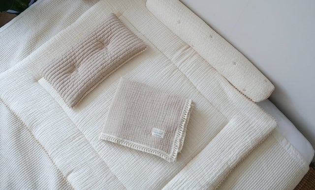 100番手の高密度キルティング生地はプレミアムな高級イブル。手触りがとても滑らかで、柔らかく通気性にも優れ、新生児にも安心してお使いいただけます。裏面は柔らかなエアウォッシュの3重ガーゼになっています。両面使用可能です。シンプルで優しいお色がインテリアにも馴染みます。低デニール綿の中綿入りでふっくら柔らかく、そのまま敷きパッドとしてお使いいただけます。お洗濯しても型崩れしにくく、長く安心してお使いいただけます。