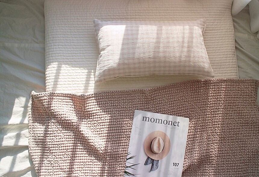 ワッフル織のブランケットは通気性がよく、適度な厚みがあり1年中お使いいただけます。