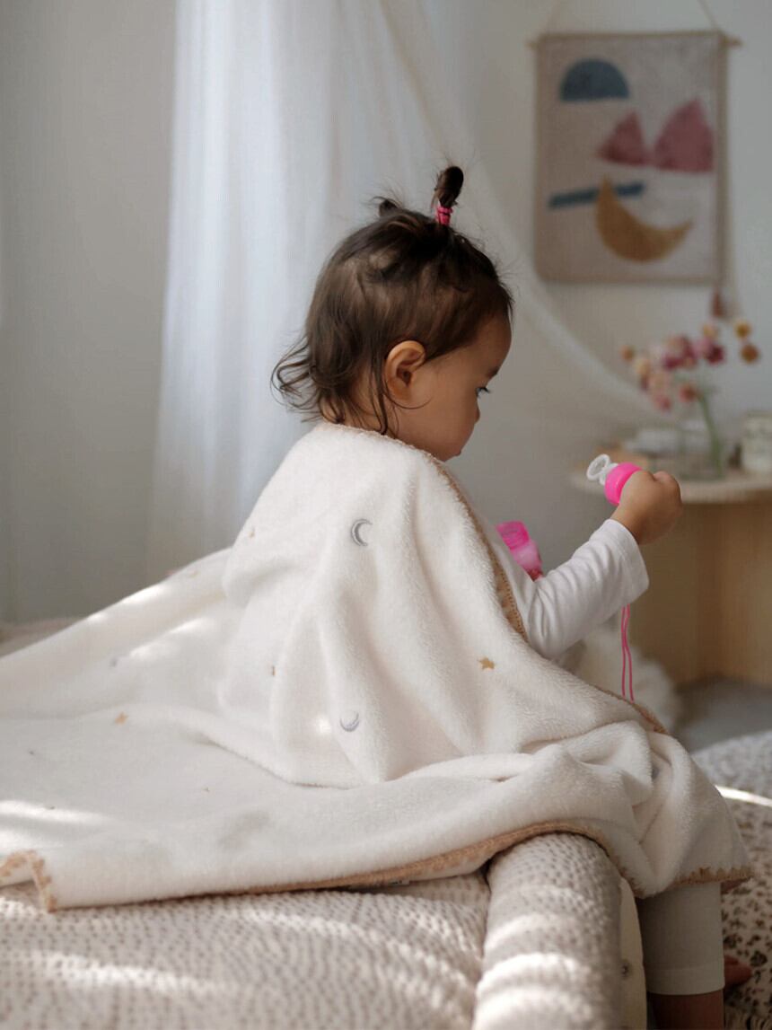 柔らかく肌触りのよいマイクロファイバー100%のブランケット。お昼寝布団とお色を合わせてお使いいただけます。金と銀色の月と星の刺繍のデザインです。