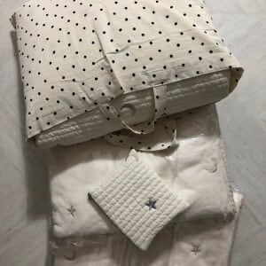 季節問わず使えます。ピグメント加工のキルティングイブルで製作されています。高密度で肌触りのよい高級綿素材です。月と星の刺繍が美しいデザインです。裏側はウォッシング綿100%です。