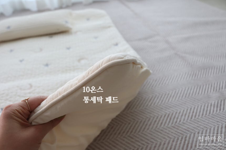 10オンスの中綿入り。キルティング綿と合わせて4~5cm程度の厚みがあります。中綿一体型で丸洗い可能です。
