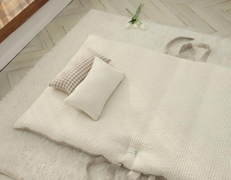 シンプルな無地のキルティングが美しいお昼寝布団セットです。お色はアイボリー×ベージュ、グレー×チャコールの組み合わせの2色になります。ブランケットもお揃いのキルティングイブル生地です。