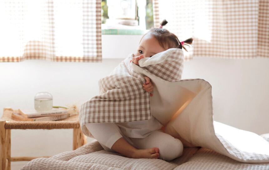 シンプルなベージュのギンガムチェックがお洒落なデザイン。掛布団と枕のセットで、長く安心してお使いいただけます。
