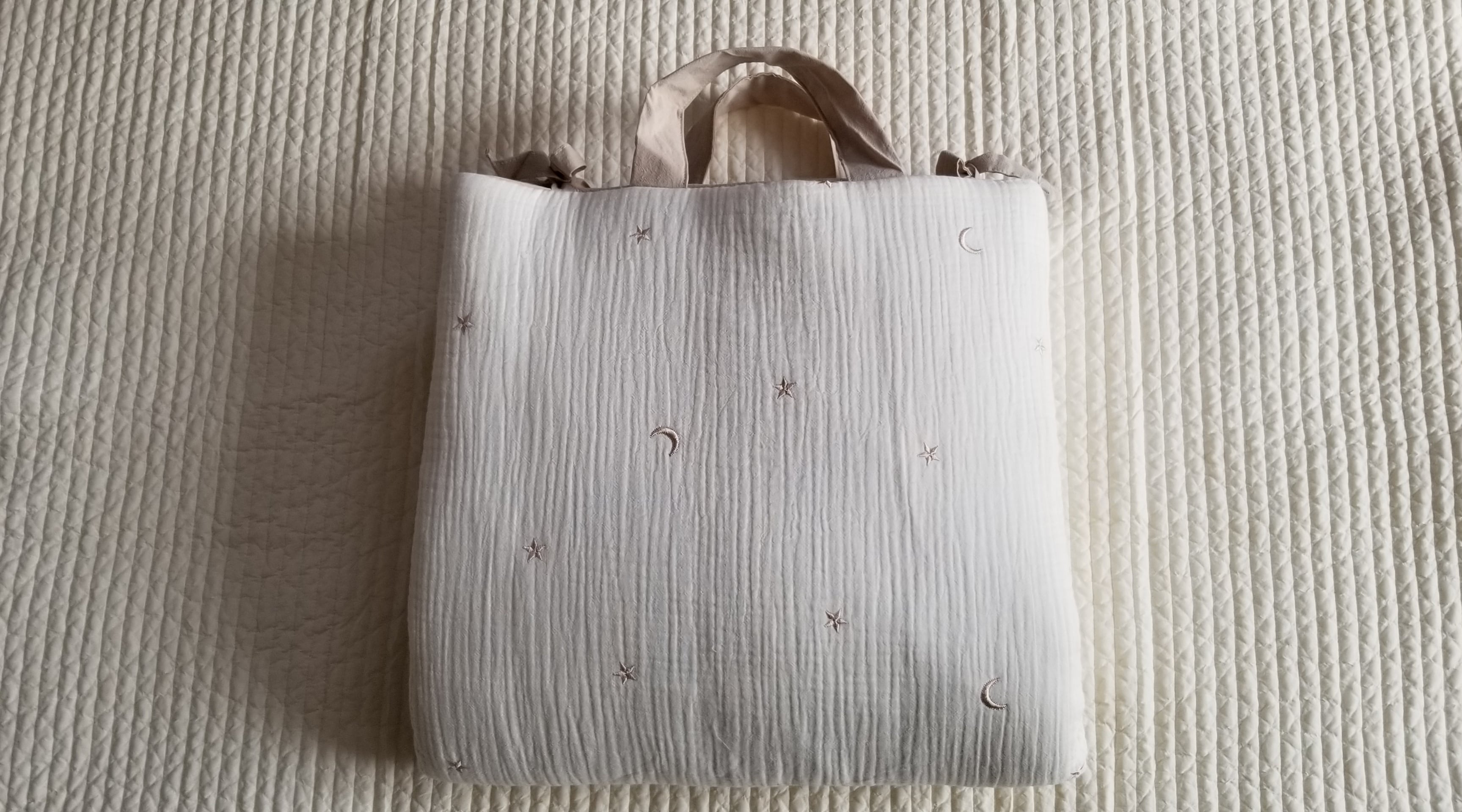 10オンスの中綿入り。キルティングの綿を加えると、合計で14オンス程度の厚みのある敷き布団です。月と星の刺繍面は3重のガーゼで柔らかく赤ちゃんにも安心の素材です。反対側は高密度のキルティング生地で、肌触りもさらりと滑らかです。お色はグリーン、グレー、ベージュの3色になります。(グレーのみ、月と星の刺繍もグレーになります。)両面使用可能。