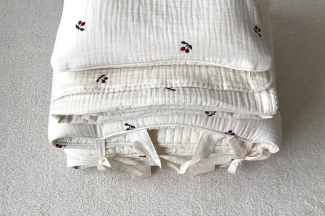 10オンスの中綿入り。キルティングの綿を加えると、合計で14オンス程度の厚みのある敷き布団です。新柄のレッドチェリーの刺繍面は3重のガーゼで柔らかく赤ちゃんにも安心の素材です。反対側は高密度のキルティング生地で、肌触りもさらりと滑らかです。お色はアイボリーになります。両面使用可能。