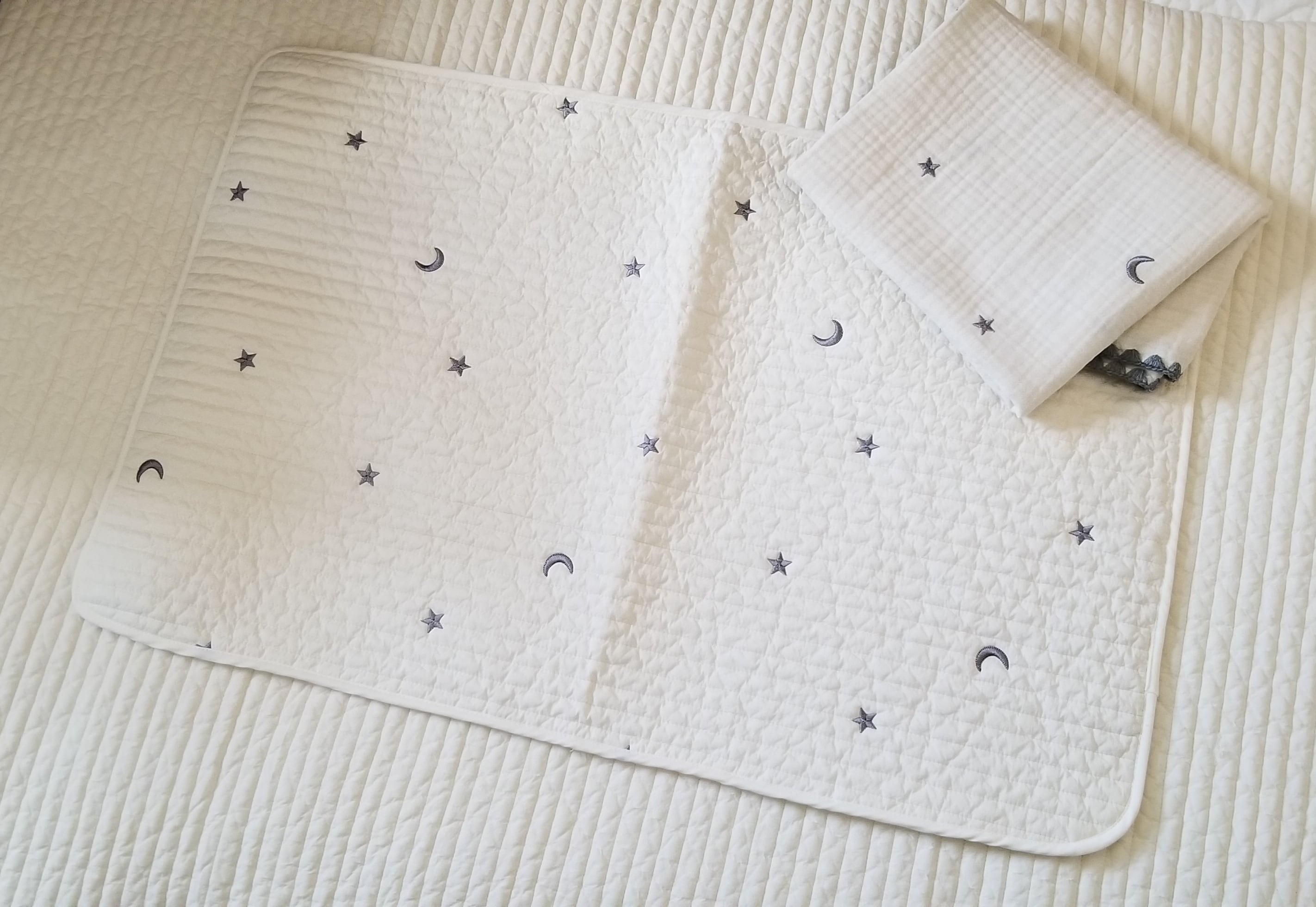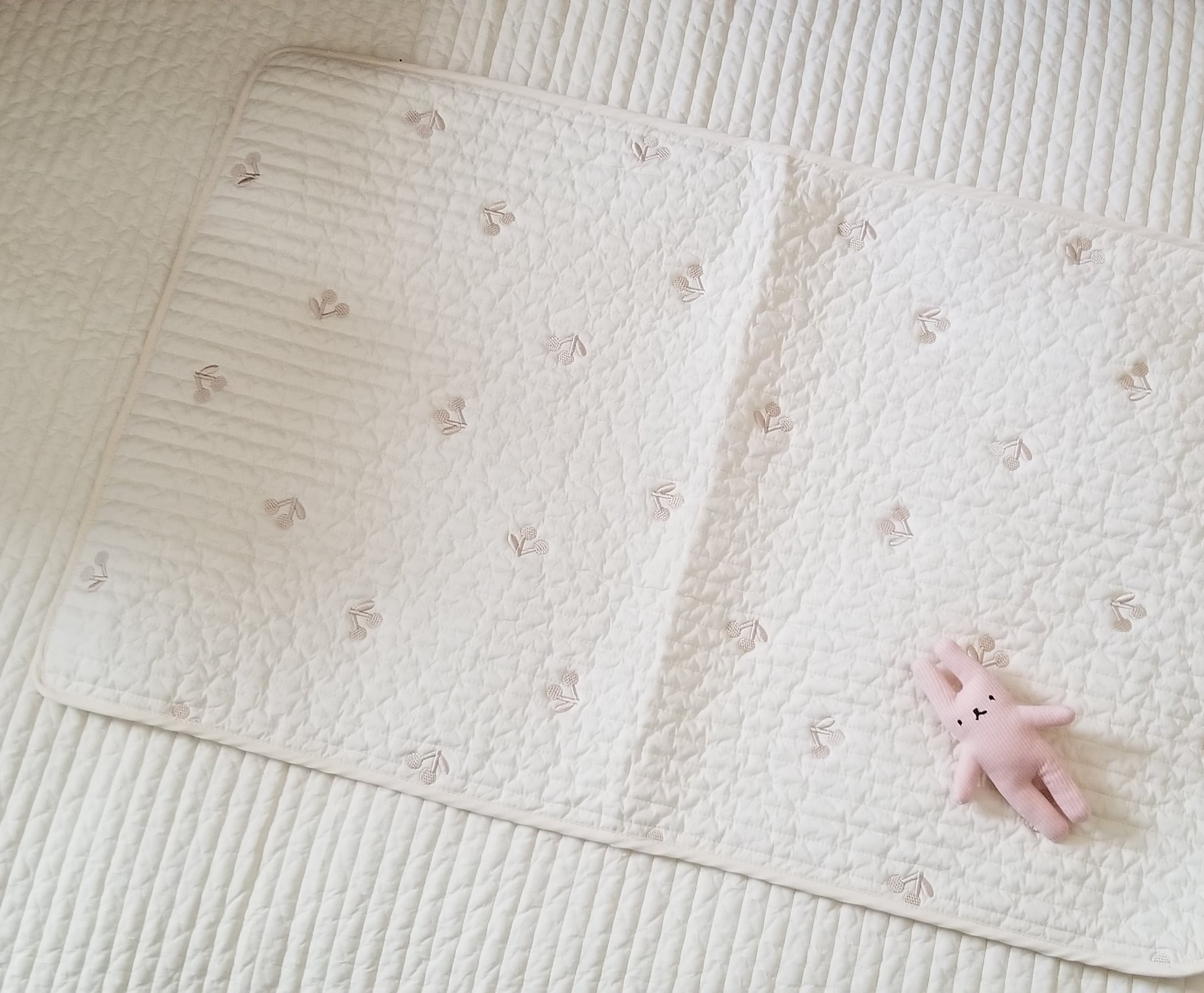 表側は、さらりとした肌触りの100番手高密度イブルを使用しています。裏側はビニールの防水生地で、ベビーのおむつ替えとしても便利です。持ち運びやすいコンパクトなサイズです。高級感がありますので、ちょっとしたプレゼントにも最適です。